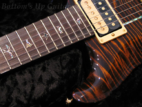 ポールリードスミス氏のご友人の為に作られた、曰くつき&超一級の造りをしたサンタナを新品デッドストックでご提供! うねるKillerフレイムをレアな『Tiger's Eye Smoked burst』フィニッシュで仕上げ、厳選素材(素晴らしい材です!)のインディアンローズネック、ハカランダ指板、マッチングハカランダヘッドストック、ボディには極上のサウスアメリカンマホガニーをセレクト。 ヘッドストックのPrivate Stock Eagle、 Santana OM Symbol、バードインレイらには14金で縁取られたグリーンハートアバロンが採用されています。 ピックアップはサンタナオリジナルゼブラ。コントロールは1ボリューム、2miniトグルスイッチ(F/R PUのON/OFFスイッチ)。現行の回路より音が良い本来のこの回路で往年のサウンドをクリエイト。 ※写真では保護シールがピックアップの上に張ってあります。 通常のサンタナII は受注生産で税込定価 1,239,000円。 プライベートストックになって、さらに何より超一級の音の良さ!であるこのサンタナモデル、極めてお買い得に設定。所有するにも演奏するにも魅力的な「A truly killer sounding Private Stock Santana!」です。 サンタナレザーケース、証明書、当社発行の保証書などが付属いたします。 Bottom's Up Price: SOLD |