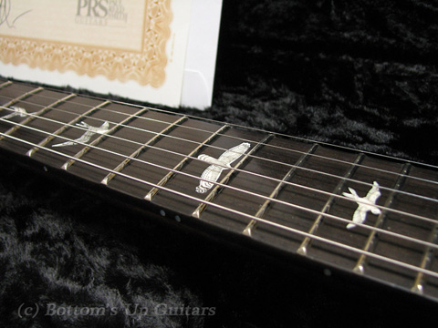 2005年初春にオーダーして待つこと実に2年半... じっくり丹念に造り上げられた完成物には全ての人が驚嘆の声をあげました。 ・PS Grade Quilt Top & Back! ・PS Grade CurlyMapleNeck! ・セミホロウボディ with シングルfホール! ・マンモスアイボリーに透かし絵のように刻まれた精緻なインレイ! ・PRSに特別に調色してもらった新色! 「!」を沢山書き連ねたくなるほど贅の限りを尽くし、そしてそれらはPS Teamの猛者達によって、極薄のサテンニトロセルロースフィニッシュと共に「楽器」として完全に昇華されています。 生音だけでも心地よい鳴りを楽しめるセミホロウのボディは、Santanaシェイプ(ソリッドとほぼ同じ寸法なのでコンパクト)。 ホロウボディほど厚くないセミホロウボディの、基音とホロウ感のミックスされたトーンと、Custom P-90の歯切れの良さは何時間でも弾いていたくなる、極上のMagical Soundを聞かせてくれます。 ジョーナッグス氏と共にBUG代表が『カスタムベージュバースト』と名付けたこのスペシャルカラーは派手とお洒落と落ち着きの三位共存を果たしており、ゴールドパーツが浮くこともないゴージャスな仕上がりです。 あえてP-90を二機搭載したこのセミホロウ・サンタナ。弾き手の呼吸に素直に応じることからスリリングな駆け引きまで全開で楽しませてくれるキャパシティがあることを実感しました。まさしく想像を遥かに超えた懐の深さを実現しています。 キルテッドメイプルバックにはマッチングされたエレクトロニクスカバー(同様のキルテッドメイプル材)を採用し、サイドドットまでこだわりのマンモスアイボリーで揃えられており、360℃全方位で鑑賞に堪えるスタイルも持ち合せています。 是非ともあなたのコレクションにPS#1398を加えてください! SOLD 購入のお申込みやご質問は商品名を書いてこちらから!または営業時間内に TEL : 03-3721-1721 までお気軽にどうぞ! |