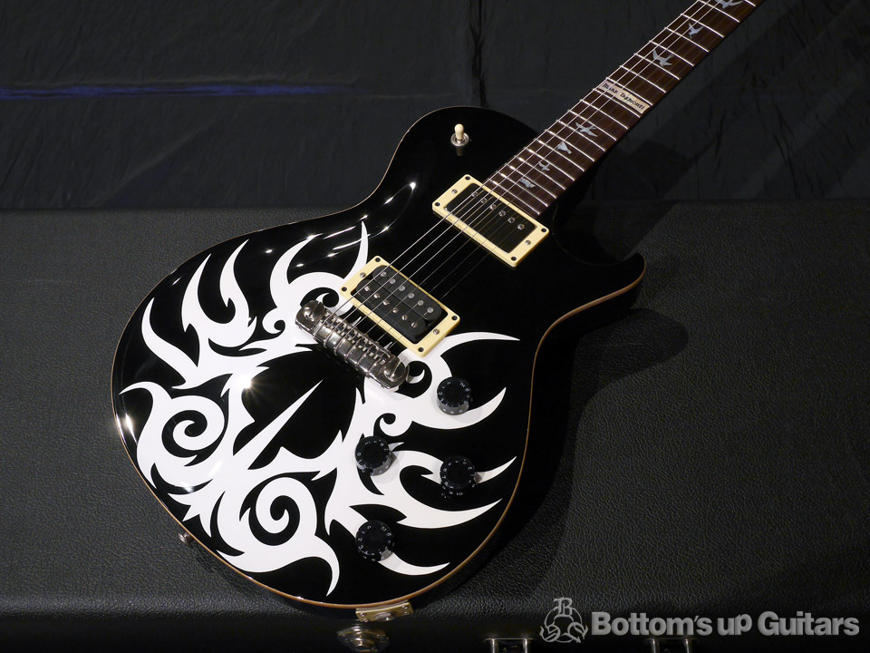 GIBSON社との訴訟問題でお蔵入りさせられた、夢の本人同仕様トライバルグラフィックモデル! 限定製作、米国内限定品! --------------- Mark Tremontiモデルの超レア限定モデル。 国内未発売のUS限定、希少生産品です。 写真のT-シャツもプレゼント致します。 ケースは撮影用のものです。 実際は通常のPRS純正ケースが付属します。 --------------- ■Alter BridgeやCREEDで活躍するヘヴィロックのカリスマギタリスト『マーク・トレモンティ』氏の愛用するポールリードスミス社のアメリカ本国数量限定生産モデルです。 Gibosn社との意匠訴訟の事前に発表され、非常に入手困難となってしまったモデルです。 結果勝訴し、このモデルの残数も生産され、その結果、リミテッドシリアルが数年に渡るヒストリーを持ったギターです。 ■本モデルには、弊店代表が実際にアメリカでトレモンティ氏に会ってサインをもらって来たバックプレートと、12フレットのシグネーチャーインレイ、それから「日本に行った際にはバックステージにおいでよ!」と言われ、さらにトラスロッドカバーにもサインをもらってきております。 ファンには貴重な宝物となることでしょう。 *Paul Reed Smith氏の直筆サインもある超コレクタブルアイテムです!! 「mark tremonti」でGoogle画像検索すると本人が使用している写真も見つかります。 SOLD プロミュージシャンのギターをセットアップする、ギター整備士常駐の店、Bottom's Up Guitars東京田園調布本店です。