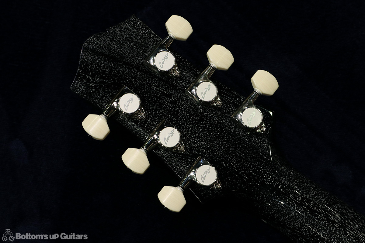 以前から、この290が弊店のイチオシでした。 なかなか入荷がなくしばらく時間が開いてしまいましたが、今回改めて弾いてみて「相変わらず異次元の鳴り方だな、、、このギター」と再確認できました。 他のギターでは感じることができないこの感覚、ぜひお試しください。 ------- 使用されている木材はホンジュラスマホガニーのボディとネックにインディアンローズウッド指板と、 貴重なマテリアルではありますが、王道のコンビネーションです。 有名無名問わず様々なメーカー、工房、個人製作家がこのマテリアルでギターを製作していますが、 このモデルを弾くたび「どうしたらこんな音が出るんだろうか・・・」と唸ります。 強いピッキングでもガッチリと受け止め、音が消える瞬間までブレずにまっすぐに伸ばしきる鳴り方は、 他のオールマホガニーボディ&ネックのギターと一線を画す鳴り感です。 アンプを通したサウンドも生鳴りの通りで、Lollar製のP-90でなければこのサウンドにはならないのだと思います。 ハムほど暑苦しくなく、ズバッと突き抜けるこのサウンドは、オールドスタイルなロックはもちろん、 現代的なサウンドメイクに於いても強烈な個性を発揮してくれると思います。 なにはともあれ、まずは一度体験して欲しい一本です。 ------- 【SPEC】 Construction Solid body single cutaway Body Honduran mahogany 1P Neck Honduran mahogany Bridge Kluson ABR-1 (Nickel-plated Zinc) Tailpiece Kluson Stop Tailpiece (nickel-plated zinc, steel studs) Fingerboard Rosewood w/ ivoroid long dots (5mm non-tapered) Pickups Lollar P90s Pots/Caps DiMarzio 500K / Jupiter Vintage Yellow 0.02μ Knobs black top hat Pickup Rings black Nut 1 11/16" Scale Length 24 7/8" Neck Joint Extra long mortise & tenon Frets Medium 18% nickel-silver Peghead Veneer Rosewood w/ MOP Collings logo Peghead Profile Haircut Tuners Nickel Gotoh w/ Collings logo Wiring 50s style Fingerboard Radius 12" Guitar Finish High gloss nitrocellulose lacquer Pickguard Black/Cream/Black Truss Rod Cover Black/Cream/Black with 290 logo ------- ★全国通信販売も行っております。 銀行振込、代金引換、各種クレジットカード決済、ショッピングクレジット(ローン)、下取り相殺などがご利用いただけます。(併用も可能です!) ★ご試奏希望の場合は事前にお電話にて在庫の確認をお願い致します。無料駐車場もございます。ぜひご自身のギターと弾き比べして満足のお買い物にしてください。 ★弊店は楽器の買取・下取りも行っております!店頭、お電話、メール(sales@buguitars.com)で随時承っております。 ★掲載楽器は一点ものとなりますので、万が一売り切れの場合はご容赦ください。 更新作業の都合上、メールでご注文頂いた時には既に売り切れている場合がございます。確実に購入する為には事前にお電話連絡をお願い致します。 TEL:03-3721-1721 その他なんなりと本商品に関するご商談はご遠慮なくどうぞ。 -------